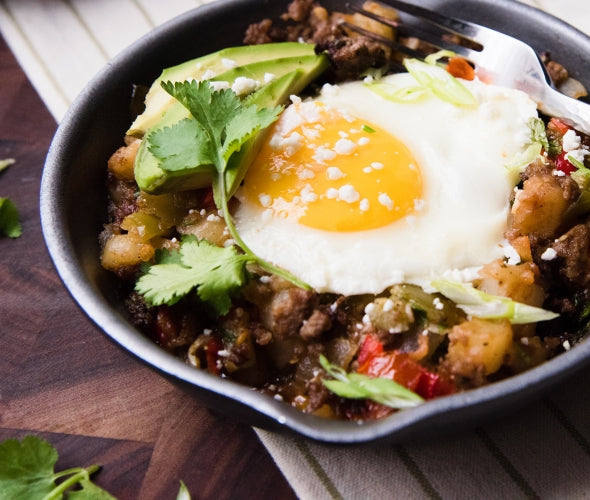 Alternatively, you can cook your eggs in a sauté pan to your desired cooking style (scrambled, over-easy, etc) and then place on top of the beef potato hash and serve. This can be served as individual portions or in one large skillet for family-style serving.
