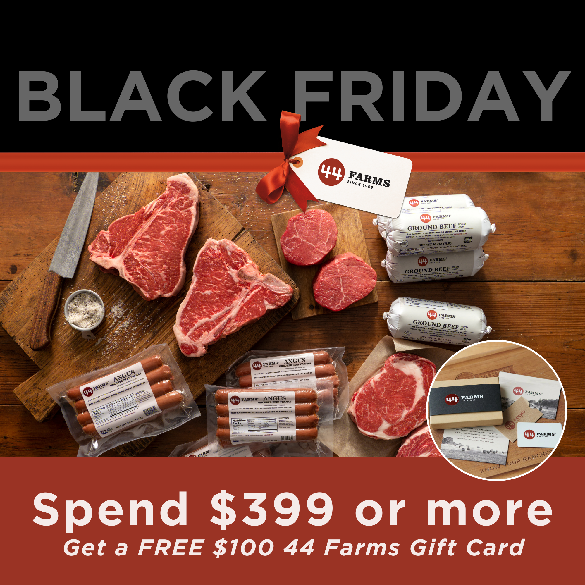 Filling your freezer with 44 Farms premium, all-natural Black Angus beef comes with delicious rewards this Black Friday. When you spend $399, we’ll send you a FREE $100 digital gift card for your next order. Steaks, roasts, ground beef, gifts… it all counts. This is our way of saying thank you and sharing a little extra Texas hospitality this holiday season.