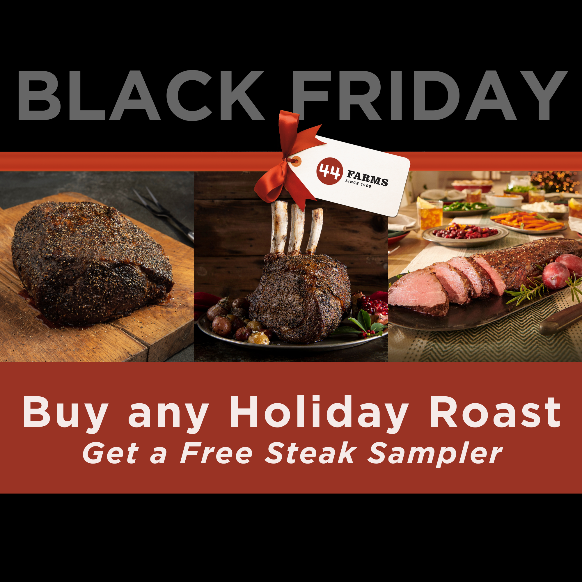 A classic, holiday centerpiece and FREE steaks! This Black Friday, when you purchase any 44 Farms Holiday Roast—Prime Rib, Tenderloin, or any of our seasonal favorites—you’ll automatically receive a FREE Steak Sampler Pack.